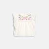 Blouse unie en double gaze de coton, broderie fleuries sur le plastron, dentelle incrustée sous le plastron, volants sur les côtés avec finitions dentelle, patte de boutonnage dans le dos de haut en bas.
