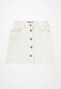 Jupe en denim blanc avec boutons pression dorés jusqu'à la taille 140 - ensuite, elle se ferme avec des boutons classiques en denim. La jupe arrive à mi-cuisse et possède une taille à passants, des poches sur le devant et un élastique interne réglable, ce qui permet d'ajuster facilement la coupe.